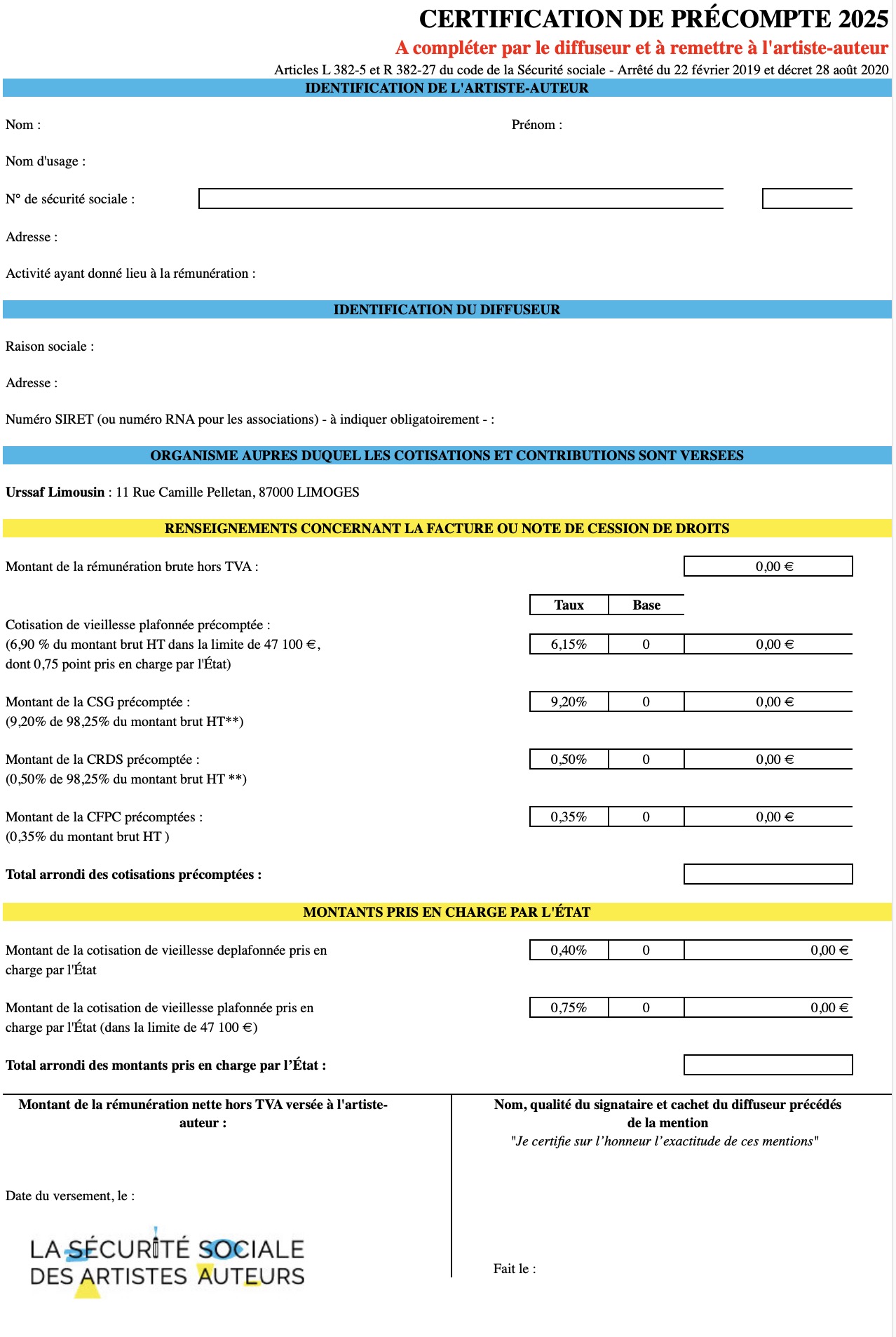 Les modèles de certificat de précompte se trouvent sur le site de la Sécurité sociale des artistes auteurs, rubrique diffuseurs. Rendez-vous sur cette page : https://www.secu-artistes-auteurs.fr/diffuseur/mes-obligations-sociales/documentation-diffuseur