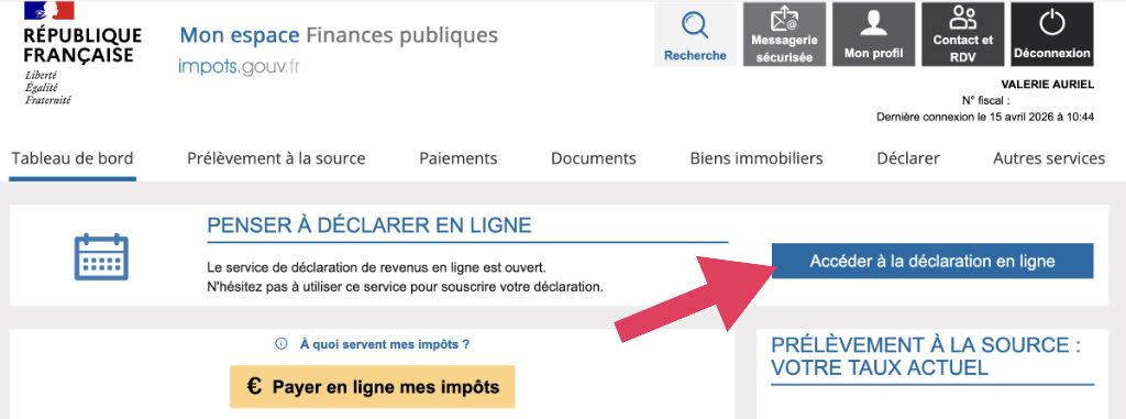 - Une fois sur votre espace « Mon espace Finances publiques », cliquez sur le bouton bleu « accéder à la déclaration en ligne » en haut de la page.